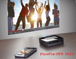 « Prêt à emporter », le pico-projecteur PicoPix PPX 3610, n’est pas un casanier. Ses dimensions en font un voyageur né : 10,5 X 10,5 X 3,15 cm pour un poids de 284 grammes. Son système d’exploitation Android et sa compatibilité DLNA lui ouvrent les portes de tout types de contenus issus d’un réseau domestique, mais pas à Google Play. Il est pourvu d’une télécommande, qui a l’originalité d’être une application Android, téléchargeable gratuitement.