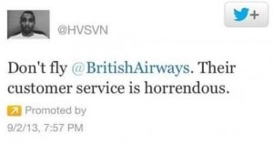Qui n’a jamais rêvé de dire tout haut ce qu’il pense d’un service ou d’une entreprise qui promettait la lune et a offert la médiocrité ? C’est ce qu’a fait un internaute en achetant un tweet sponsorisé normalement destiné à faire la promotion des entreprises, pour critiquer British Airways. Une vengeance qui a dû couter assez cher à ce dernier, lorsque l’on sait que ce genre de tweet à très forte viralité coute plusieurs milliers d’euros.