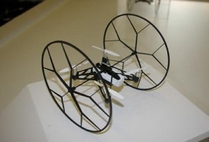 La particularité du MiniDrone de Parrot réside dans sa possibilité de voler (pas de surprise de ce point de vue là) mais également de rouler. En effet, l’appareil, qui pourrait ressembler vaguement à un (très) gros moustique, dispose de deux grandes roues intérieures (amovibles) qui lui permettent de rouler non seulement au sol, mais également au plafond !