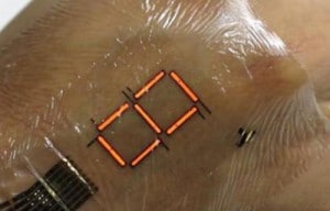 L’e-Skin est une sorte de patch à coller sur la peau, transparent et contenant quelques capteurs, ainsi qu’une diode, donc le rôle est d’analyser un paramètre physiologique et d’afficher le résultat directement sur la surface de la peau. Concrètement, il est possible d’envisager des patchs de type e-Skin pour faire apparaître en temps réel la fréquence cardiaque, le taux de glucose, la pression, la saturation en oxygène, et bien d’autres paramètres, en fonction des capteurs qui seront intégrés sous le film transparent.