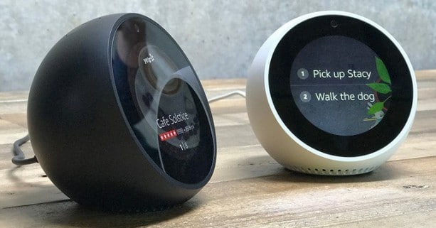Le réveil intelligent Echo Spot semble largement s’inspiré du réveil Bonjour de chez prix de l’innovation 2017. Amazon a opté pour une forme de boule tronquée mesurant 104 x 97 x 91 mm et intégrant un écran couleurs de 2,5 pouces sur lequel vous pourrez voir l’heure, mais pas seulement ! Cet écran permet d’obtenir des notifications, la météo, de consulter votre agenda, de converser avec Alexa l’assistant virtuel maison d’Amazon et bien plus encore.