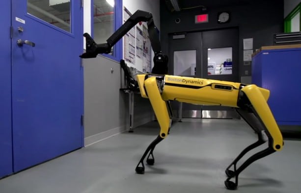 Boston Dynamics a une fois de plus fait une démonstration de son talent dans son domaine et le résultat est assez bluffant, comme on peut le voir dans la vidéo en fin d’article. En effet, on y voit un robot-chien SpotMini se diriger vers une porte et comprendre qu’il ne l’ouvrira pas, il fait donc appel à l’aide d’un autre robot disposant d’un bras articulé, ce dernier lui ouvre la porte et la retient pour le laisser passer.