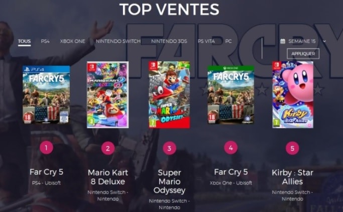 La semaine dernière Far Cry 5 caracolait en tête des ventes sur console et s’offrait même le luxe de s’emparer des trois premières marches du podium. Pour cette semaine 15 (du 9 au 15 avril 2018), Far Cry ne réussi pas l’exploit de ravir les trois places à nouveau, mais il reste numéro 1 des ventes et numéro 4.