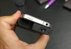D’une taille à peine plus grande qu’une grosse coque, ce projecteur permet d’accueillir un iPhone 4 ou 4S. Le point fort de cet accessoire est bien entendu son très faible encombrement puisque l’ensemble projecteur + iPhone tiens facilement dans n’importe qu’elle poche (126,6×63, 5x22mm pour un poids de 97g seulement).