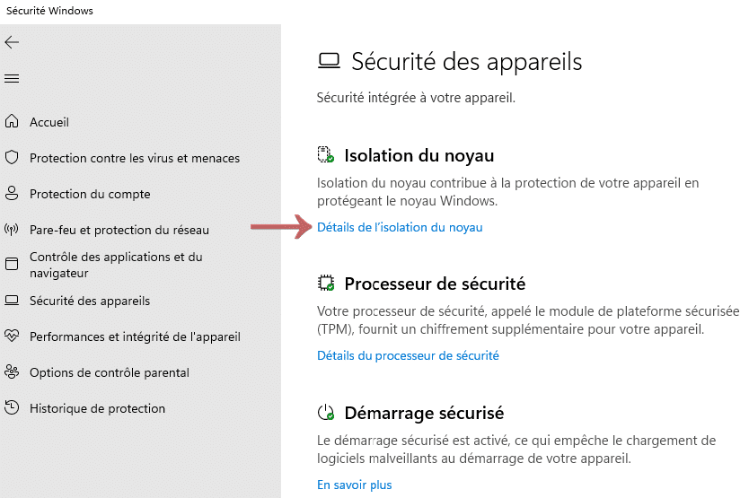 - Cliquer sur le lien Détails de l’isolation du noyau dans la section Isolation du noyau :