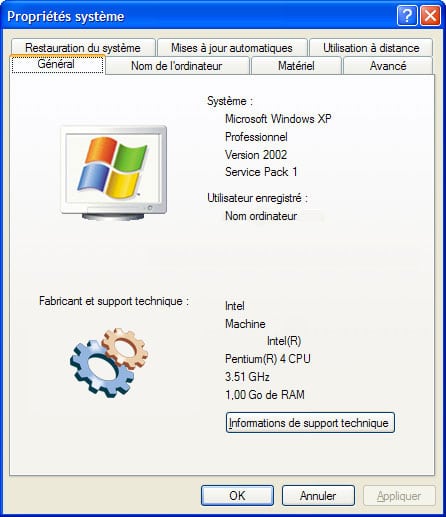 Seules les deux lignes de la section [General] seront visibles dans l’onglet Général des Propriétés système. Les lignes supplémentaires de la section [Support Information] seront visibles dans la fenêtre affichée lors du clic sur le bouton Informations de support technique.