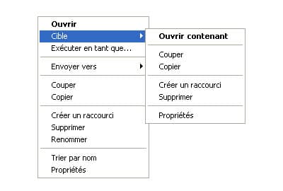 Comme vous pouvez le voir, le second menu comprend également les options Couper, Copier, Coller, Créer un raccourci, Supprimer et Propriétés. Ces nouvelles options s’appliquent donc non pas au raccourci lui-même mais à la cible. Ouvrir contenant ouvrira alors automatiquement le dossier contenant la cible du raccourci avec le fichier cible sélectionné.
