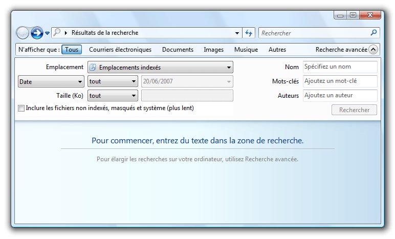 Habituellement, la recherche de fichiers sous Windows se fait à l’aide d’un ou plusieurs mots clés en rapport au texte contenu dans le nom du fichier et dans le fichier lui-même. Pour réduire les résultats, il est également possible d’utiliser des filtres booléens (comme ET, OU, SAUF…) qui permettent de combiner des mots de recherche en y associant une logique simple. Mais Windows Vista va plus loin puisqu’il est possible d’activer une recherche en langage naturel.