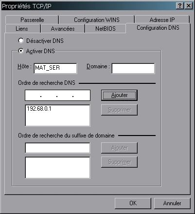 Cliquez sur Activer DNS, puis entrez le nom de l’ordinateur esclave (par exemple MAT_SER), laissez la case “Domaine” vide et entrez l’adresse IP du PC esclave dans la case Ordre de recherche de DNS(toujours 192.168.0.1)