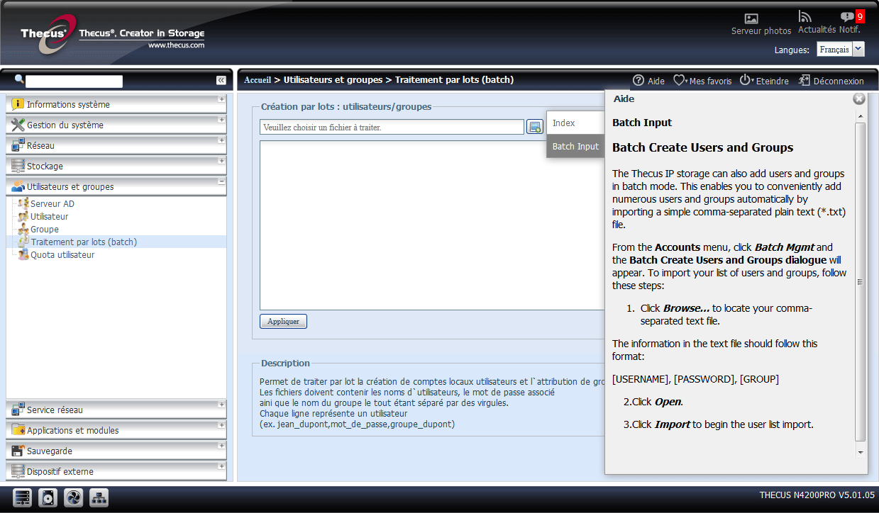 Toujours tourné vers les environnements réseau professionnels, Thecus propose même la création de comptes utilisateurs en masse, à partir d’un simple fichier texte contenant entre autres, le login, le mot de passe et le groupe d’appartenance. Cette fonctionnalité est clairement un plus pour les administrateurs réseaux. Par contre nous ne connaissons pas le nombre maximal de comptes que l’on peut créer ainsi, ni les capacités maximales de connexions simultanées au NAS.