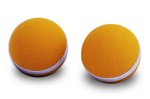 Les haut-parleurs en eux-mêmes ressemblent à s’y méprendre à une grosse balle de tennis (à peine moins de 9cm de diamètre pour un poids de 270gr) recouverte de tissu alvéolé jaune.