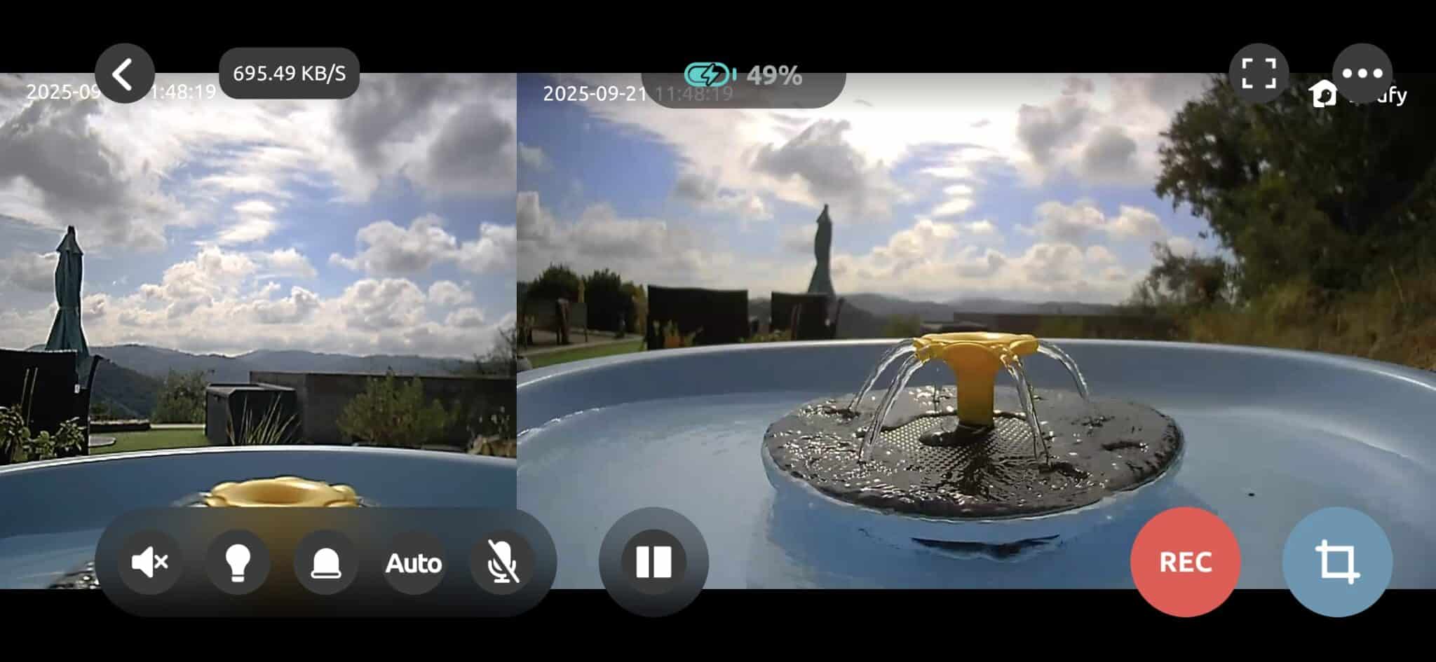 Là où le Birdfy Bath Pro crée la surprise, c’est dans l’utilisation d’une double optique. Une première caméra grand angle de 2 MP en 1080p observe toute la scène : les interactions, l’arrivée des oiseaux, leurs hésitations, leurs premiers pas sur le rebord. La seconde, motorisée, de 3 MP en 2K avec 100 FPS, pensée pour le portrait, se charge de zoomer automatiquement pour capturer les détails. C’est cette alternance qui donne l’impression de transformer le bain en mini-plateau de tournage naturel. Néanmoins, si la qualité de la caméra principale est très bonne, on regrettera que cette dernière chute drastiquement en très faible luminosité, même avec le flash intégré.