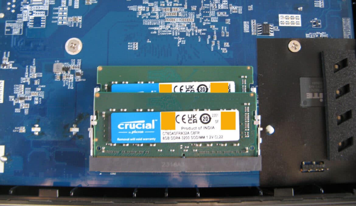 En se basant sur les caractéristiques de compatibilité pour le FS6712X publiées sur le site d’Asustor, ainsi que sur la mémoire déjà présente, nous avons opté pour une extension de 16 Go de la marque CRUCIAL. Le kit 2×8 Go porte la référence CT2K8G4SFRA32A et comporte deux barrettes mémoires au format SODIMM, testées pour fonctionner parfaitement en symbiose. De type DDR4-3200, elles supportent une tension de 1,2V, et un CL22 (Cas Latency de 22 ns).