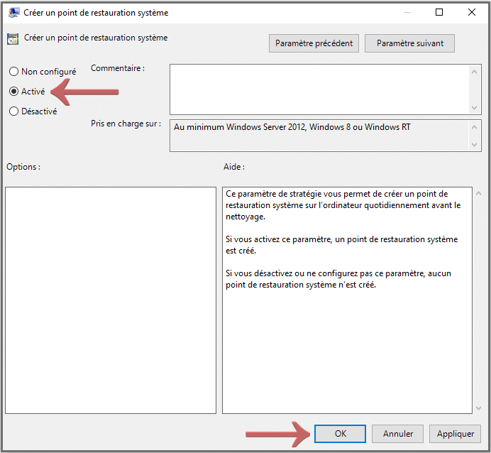 - Sur la droite, double-cliquez sur le paramètre Créer un point de restauration du système, sélectionnez l’option Activé puis cliquez sur le bouton OK :