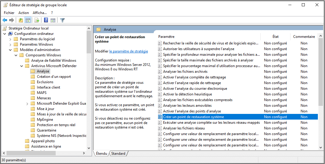 - L’éditeur de stratégie de groupe locale s’ouvre. Sur la gauche, allez dans Configuration ordinateur > Modèles d’administration > Composants Windows > Antivirus Windows Defender > Analyse :