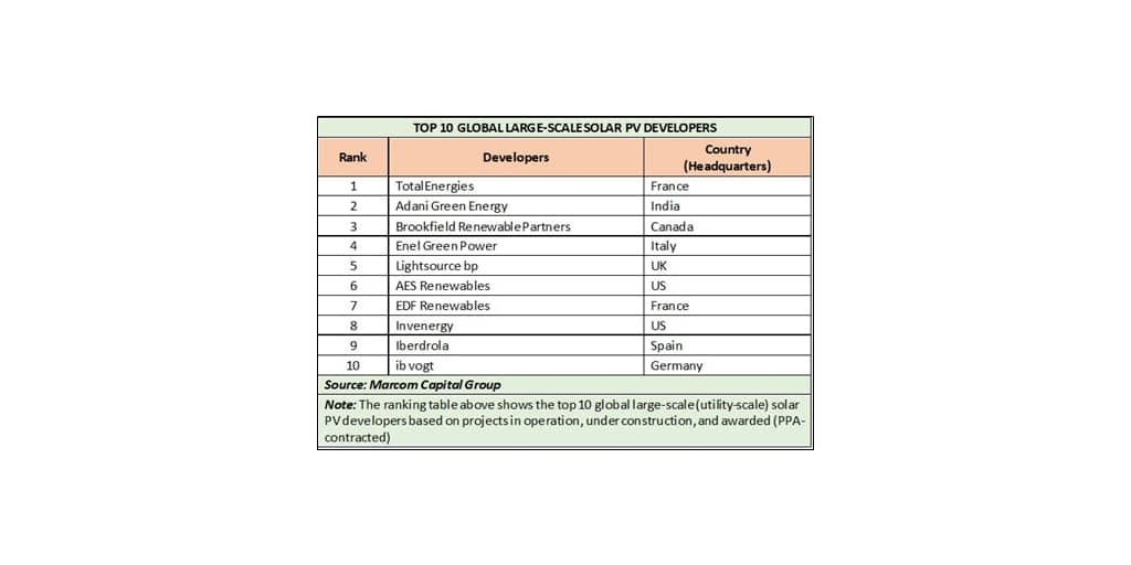 Mercom Capital Group, une société de renom spécialisée dans les énergies propres et la recherche, a publié son rapport qui met en évidence les dix premiers développeurs mondiaux de solaire photovoltaïque à grande échelle sur la base des données de juillet 2022 à juin 2023. Il contient les données des projets d’une capacité supérieure à 1 MW, qui comprennent la capacité opérationnelle, les projets en cours de construction et les projets attribués en vertu d’un Power Purchase Agreement (PPA).