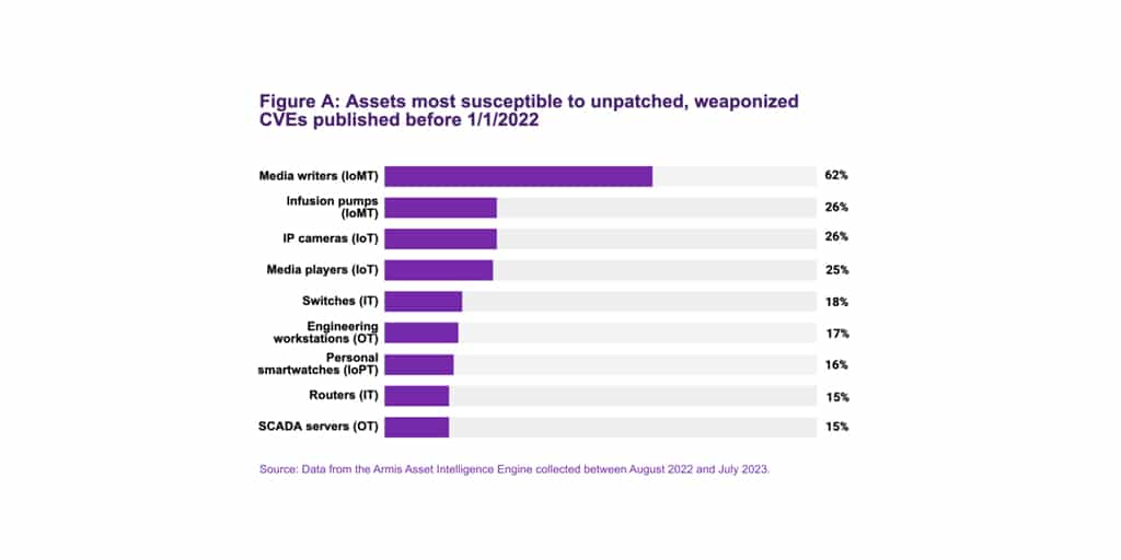 Les chercheurs ont identifié un nombre important d’actifs connectés au réseau. Ces actifs sont également susceptibles de présenter des vulnérabilités non corrigées et exploitées par des CVE (Common Vulnerabilities and Exposures) publiées avant le 1er janvier 2022. En se concentrant sur le pourcentage le plus élevé d’appareils de chaque type qui présentaient ces CVE entre août 2022 et juillet 2023, Armis a identifié la liste reflétée dans la Figure A. S’ils demeurent inchangés, ces actifs impliqueront un risque non négligeable pour les entreprises.