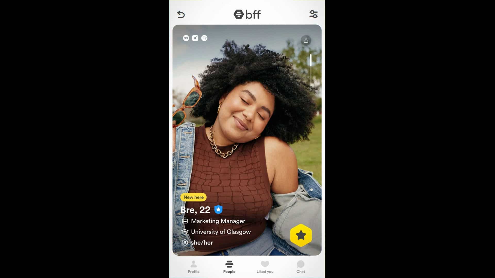 - Bumble For Friends propose une expérience similaire à celle de Bumble Date, où les membres voient des profils d’ami.e.s potentiels basés sur des intérêts communs, balaient à droite sur les profils avec lesquels ils souhaitent se connecter et sont informé.e.s lorsqu’un.e autre membre exprime son intérêt.