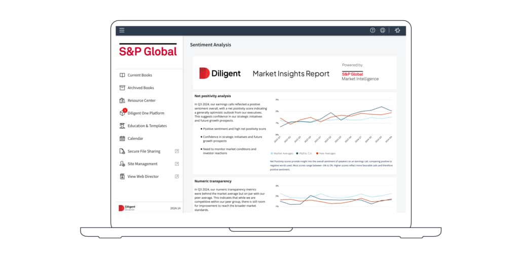 Dans le contexte d’un paysage commercial en constante évolution, les conseils d’administration et les dirigeants d’entreprises publiques, ont besoin d’obtenir des données financières pertinentes en temps opportun pour prendre des décisions avisées. Diligent Market Insights Reporting intègre les données financières exceptionnelles de S&P Global Market Intelligence à Diligent Boards pour fournir des rapports, conçus par des experts du secteur, sur la position du marché d’une entreprise, directement aux conseils d’administration et aux dirigeants. Cette intégration implique une livraison plus rationalisée de données soigneusement sélectionnées, offrant ainsi aux dirigeants une meilleure visibilité sur les risques liés aux investisseurs.