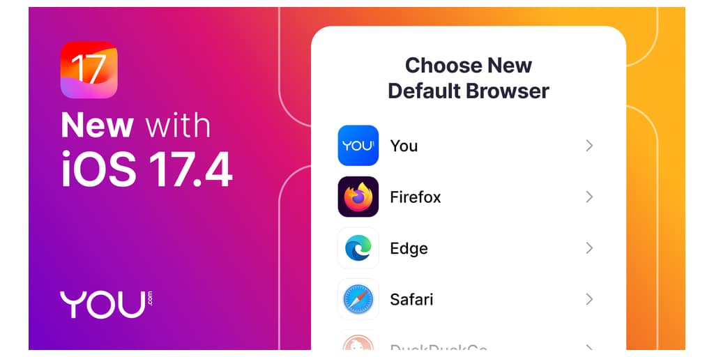 PALO ALTO, Californie–(BUSINESS WIRE)–You.com annonce sa désignation comme l’une des rares nouvelles options de navigateur par défaut sur iOS 17.4 pour les utilisateurs de l’Union européenne, ainsi que des mises à jour importantes de son application de navigation mobile optimisée par l’IA, You.com AI Search and Browse.