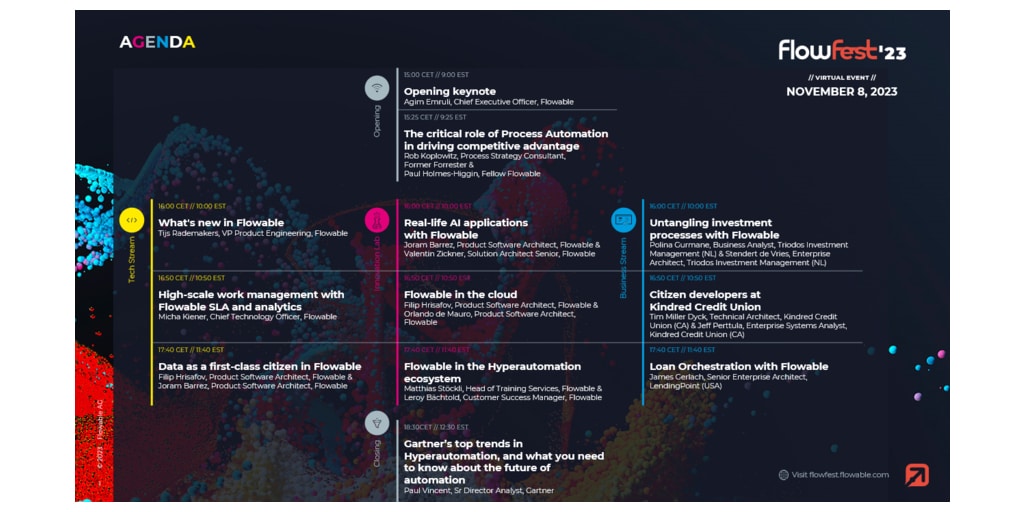 Suite à l’immense succès de l’événement de l’année dernière, FlowFest’23 est de retour, et ce, entièrement virtuel et gratuit. Avec Gartner et Forrester en tête d’affiche, les participants découvriront un aperçu du monde en constante évolution de l’automatisation des processus d’entreprise. Les sujets clés incluent l’émergence de tendances telles que l’hyperautomatisation et l’intelligence artificielle et leur influence sur le paysage de l’automatisation.