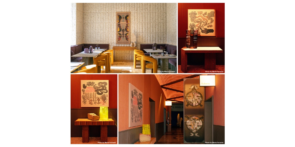 Trois œuvres sont présentées dans l’Alchemic Corridor et une autre dans l’Herbarium Restaurant. Les écharpes portées par le personnel utilisent en outre la technologie d’impression de FOREARTH.