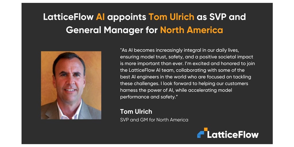 ZÜRICH–(BUSINESS WIRE)–LatticeFlow AI, la principale plateforme d’intelligence artificielle (IA) permettant aux entreprises de créer des systèmes d’IA performants, sûrs et fiables à grande échelle, a annoncé aujourd’hui la nomination de Tom Ulrich en tant que premier vice-président et directeur général pour l’Amérique du Nord. Plus récemment, Tom a occupé le poste de vice-président des ventes, services financiers chez C3.AI, où il a joué un rôle clé dans le lancement de l’activité bancaire d’IA de la société, ce qui a conduit à une introduction en bourse en 2019 (NYSE : AI).