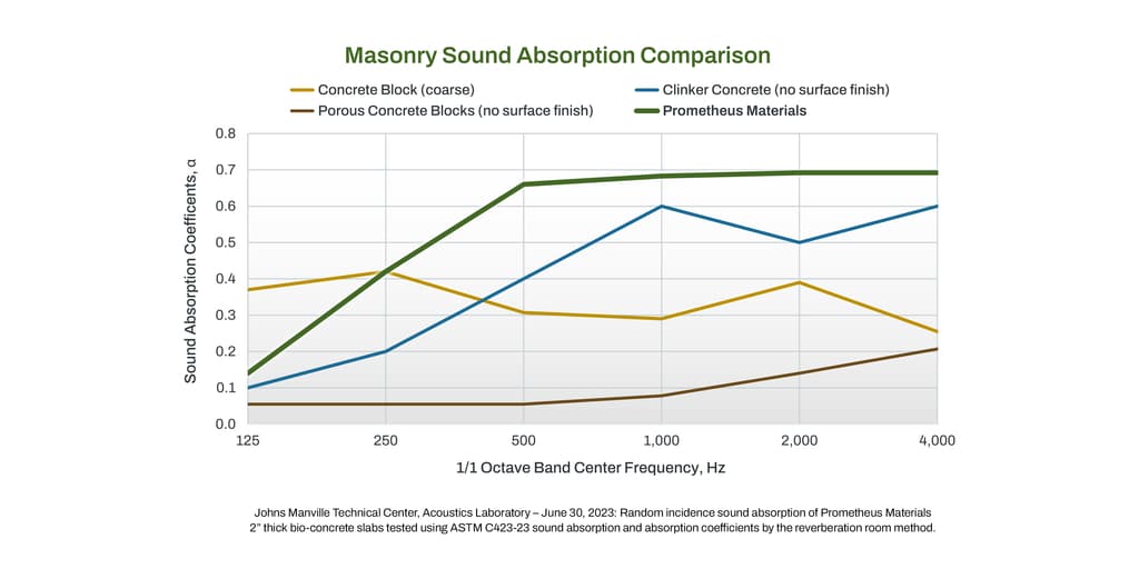 Le centre de recherche et de développement de renommée mondiale Johns Manville Technical Center, situé à Littleton dans le Colorado, a effectué les tests indépendants. Ces derniers ont révélé que le bio-béton de Prometheus Materials présentait un coefficient de réduction du bruit (NRC) de 0,60. Ce coefficient indique une capacité d’absorption acoustique de 60 %, soit douze fois plus que le béton traditionnel.
