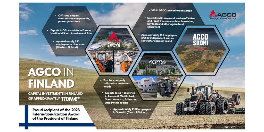 « Le développement d’AGCO en Finlande est une réussite et nous sommes ravis de recevoir cette récompense prestigieuse », déclare Eric Hansotia, président du conseil d’administration et PDG d’AGCO. « Nous portons beaucoup d’importance à nos équipes et au travail axé sur l’agriculture qu’elles accomplissent dans ce pays. Nos investissements continus réalisés dans notre personnel, nos usines et nos produits en Finlande se font sentir chez les agriculteurs des quatre coins du monde, car ces derniers contribuent à nourrir durablement notre monde. »
