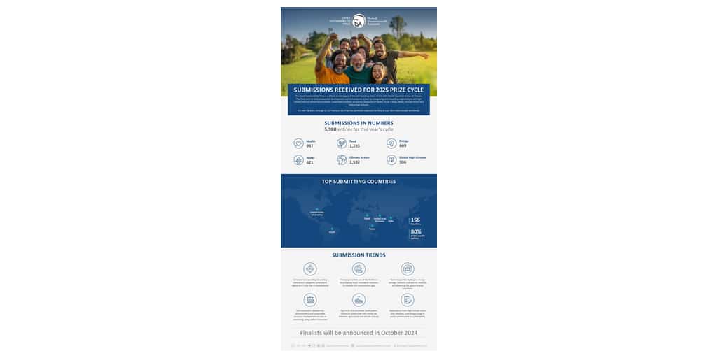 Cette année, les pays d’où ont été soumis le plus de projets sont le Brésil, l’Inde, le Kenya, l’Égypte, les Émirats arabes unis et les États-Unis. Le Prix a accepté des candidatures en plusieurs langues, dont l’anglais, l’arabe, l’espagnol, le français, le mandarin, le portugais et le russe, afin de promouvoir l’inclusivité et assurer une plus grande participation, en permettant à plus de régions et de cultures d’être représentées.