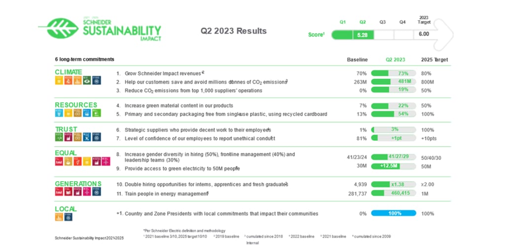À la fin du trimestre, le score global de l’impact sur le développement durable (SSI) de Schneider Electric était de 5,28, en passe d’atteindre l’objectif de 6 sur 10 à la fin de l’année 2023.