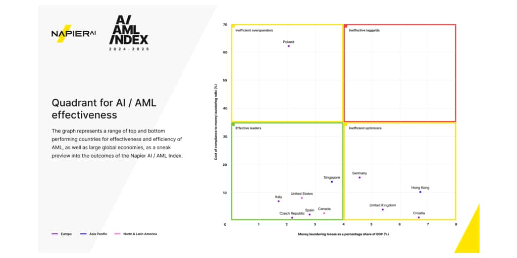 Le rapport Napier AI / AML Index fournit les informations les plus complètes du secteur sur l’impact de l’IA dans la lutte contre le blanchiment de capitaux et le financement du terrorisme. Le rapport classe 35 marchés mondiaux en fonction de leur efficacité en matière de conformité à la criminalité financière.