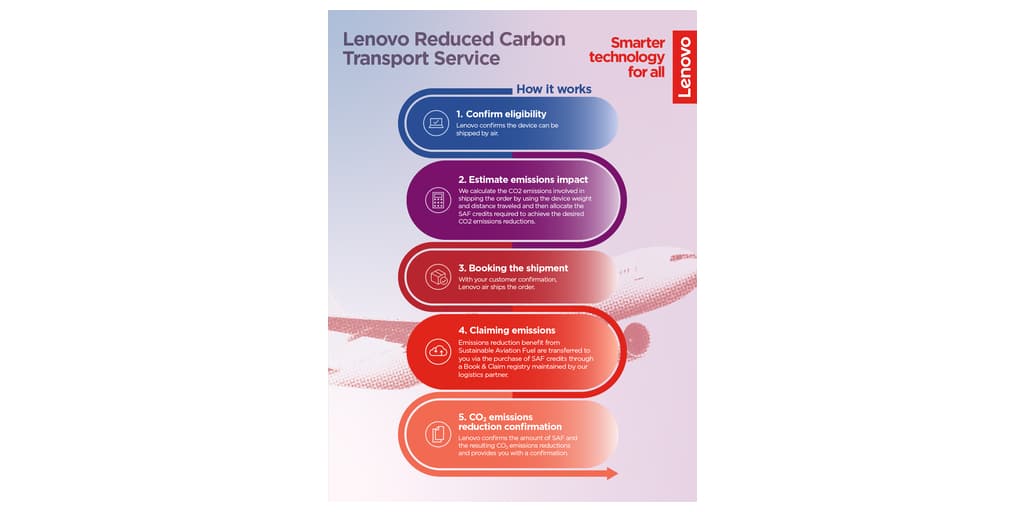 RALEIGH, Caroline du Nord–(BUSINESS WIRE)–Afin d’aider les entreprises sensibles aux émissions de carbone dans leur démarche de développement durable, Lenovo propose un service de transport à teneur réduite en carbone, une offre différente qui offre aux entreprises la possibilité de réduire leur empreinte carbone lorsque les appareils informatiques sont transportés par fret aérien. Grâce à ce service, les clients peuvent acheter des crédits de carburant d’aviation durable (SAF) et affecter la réduction des émissions ainsi obtenue à leur achat de matériel informatique, ce qui permet de réduire les émissions de CO2 d’au moins 70 %.1.