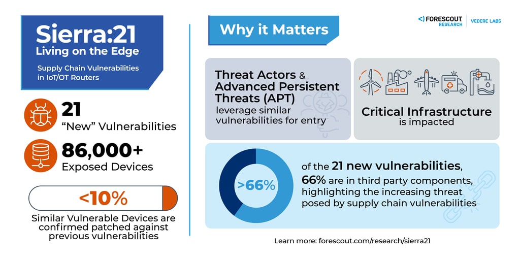 SAN JOSE, California–(BUSINESS WIRE)–Forescout, un leader mondial en cybersécurité, a publié aujourd’hui « SIERRA:21 – Living on the Edge », une analyse de 21 vulnérabilités récemment découvertes dans les routeurs OT/IoT et les composants logiciels open source. Le rapport – produit par Forescout Research – Vedere Labs, une équipe mondiale de haut niveau dédiée à la découverte de vulnérabilités dans les infrastructures critiques, met l’accent sur le risque continu pour ces infrastructures et met en lumière des mesures d’atténuation possibles.