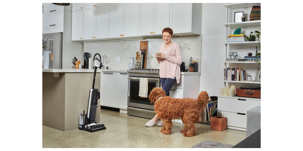 Tineco iCARPET est un nettoyeur de tapis doté de deux réservoirs d’eau et une large brosse à poils. Il lave et sèche les surfaces.