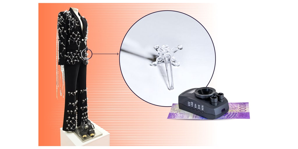 Par exemple, les lentilles moulées en interne par Regula (généralement utilisées pour permettre l’effet anti-Stokes lors de l’examen des éléments de sécurité des documents) sont devenues les ornements du costume d’une véritable employée de bureau milanaise, ou Office Siren, comme l’ont appelée les créateurs.