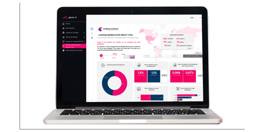 Cet outil innovant arrive à un moment clé pour l’industrie, à la suite de l’annonce par Google de l’élimination imminente des cookies tiers prévue pour le second semestre 2024. Gauss Cookie Deprecation Impact Tool fournira à nos clients des données précises sur la façon dont cette perte d’informations affectera leur activité. Il s’agit d’une évaluation sans précédent qui permettra aux entreprises, pour la première fois, de connaître avec des données réelles le pourcentage d’utilisateurs qui visitent des sites web et des applications sans cookies, corroborant ainsi l’effet de ce changement sur leurs stratégies marketing. La solution fournit déjà des données significatives sur une sélection de clients de Making Science, démontrant un impact pouvant atteindre une baisse de 30% de leur taux de conversion.