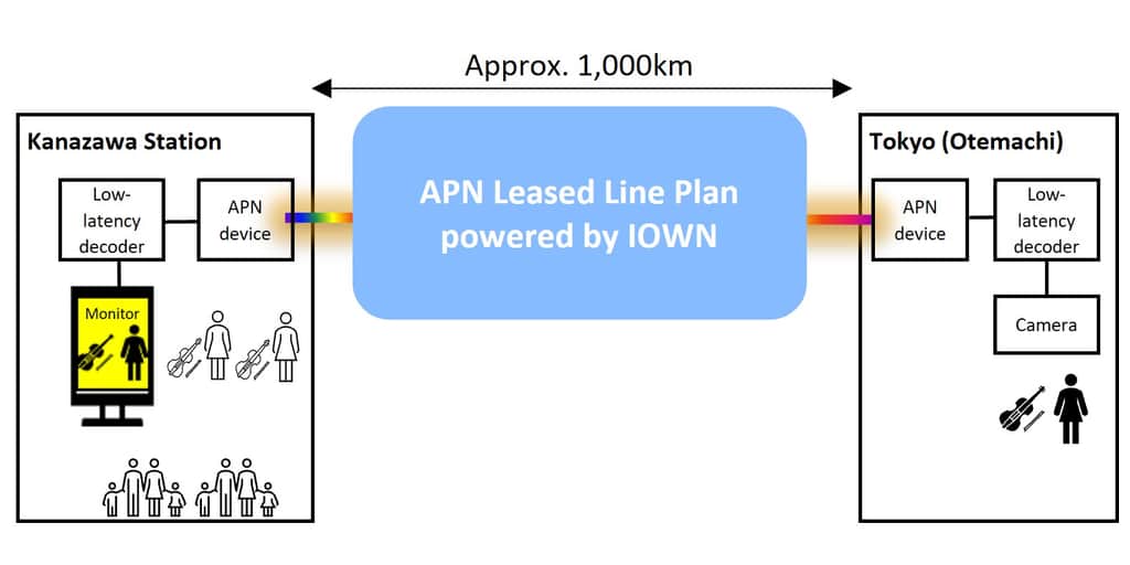 Ces événements comprenaient une performance à distance en direct qui reliait de manière transparente les musiciens de Kanazawa et de Tokyo, à une distance d’environ 1 000 kilomètres, via le réseau All-Photonics Network (APN). Pour la connexion, NTT Com a fourni son plan de lignes APN louées basé sur IOWN,2 qui a utilisé le plus long câble optique jamais déployé dans une démonstration IOWN et le premier à être déployé dans la région japonaise de Hokuriku.