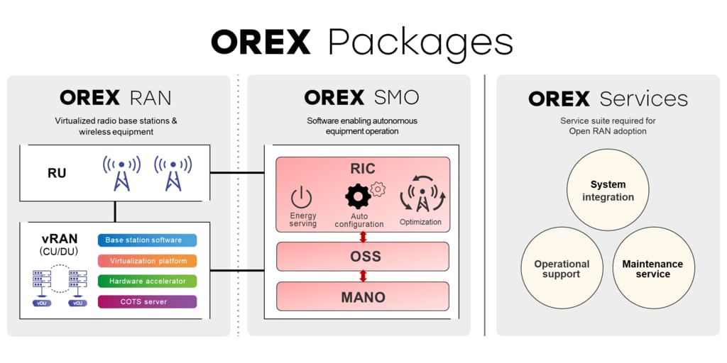 OREX est la marque du service Open RAN de DOCOMO, développée en collaboration avec plusieurs distributeurs mondiaux. Elle peut être personnalisée pour répondre aux défis uniques de chaque client. L’introduction des services Open RAN d’OREX devrait réduire le coût total de possession aux clients jusqu’à 30 %, en prenant en compte les coûts d’installation initiale et la maintenance en cours. Elle peut aussi réduire le temps requis pour la conception du réseau à jusqu’à 50 %. En outre, OREX réduit la consommation d’énergie aux stations de base jusqu’à 50 %.