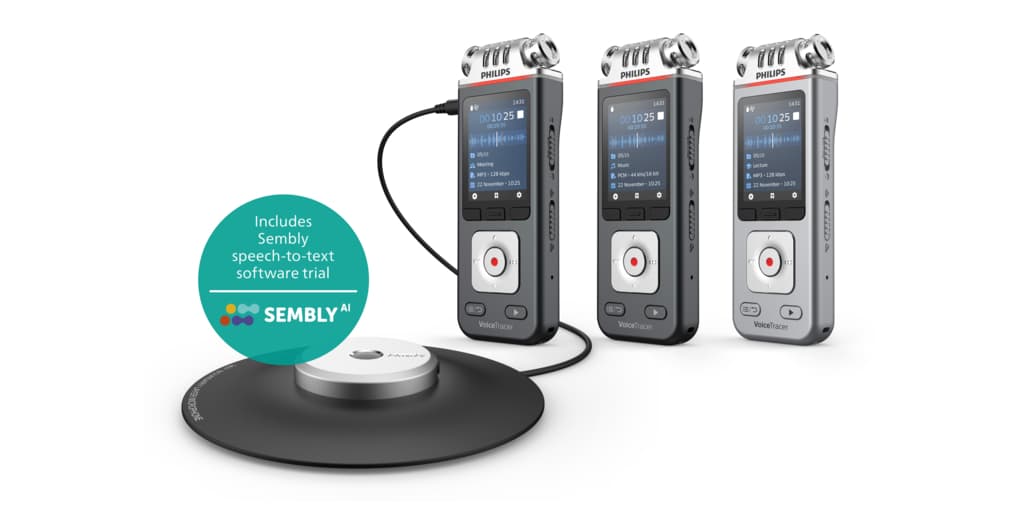 Les nouveaux DVT4115 et DVT6115 d’enregistrement audio Philips VoiceTracer, conçus pour les étudiants, sont dotés de 3MIC pour l’enregistrement longue distance, idéal pour capturer des conférences et des entretiens. Sembly peut ensuite transcrire et résumer ces enregistrements. Le nouveau DVT8115 Philips VoiceTracer, équipé d’un microphone à 360°, est parfait pour enregistrer les comptes rendus de réunions. Grâce à la fonction de partage facile de Sembly il est possible de partager rapidement les comptes rendus et les points d’action avec membres de l’équipe.