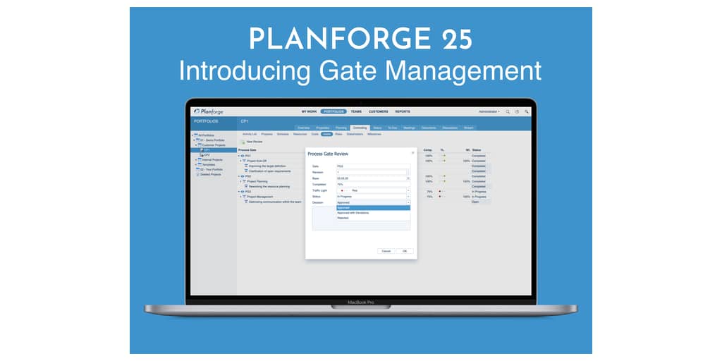En outre, Planforge intègre désormais un processus simple, mais puissant de révision des portails, dans le cadre duquel les décisions d’acceptation ou de refus, les révisions des process gates et les mesures requises peuvent être suivies facilement et avec précision. Cela permet des alertes précoces, une plus grande transparence et des indicateurs de performance clés (KPI) plus pertinents. Toutes les informations relatives aux portails sont clairement résumées dans de nouvelles vues dédiées à la planification et au contrôle des portails, que ce soit dans le cadre d’un seul ou de plusieurs projets.