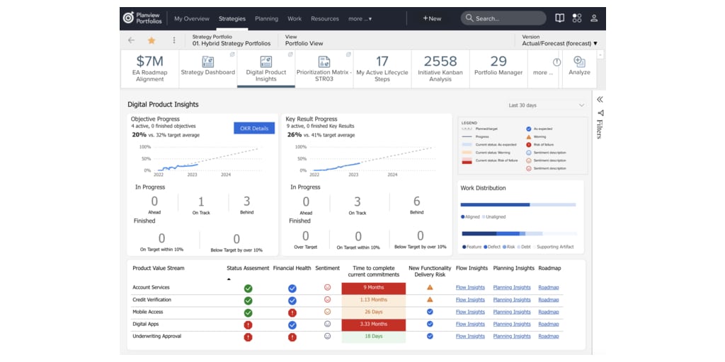 AUSTIN, Texas–(BUSINESS WIRE)–Planview, la plateforme leader pour le travail numérique connecté, de la planification de portefeuille à la livraison, a annoncé aujourd’hui une première offre sur le marché–Digital Product Insights–qui combine la gestion de portefeuille et la planification agile avec des informations sur la livraison provenant de la gestion du flux de valeur (VSM) et des objectifs et résultats clés (OKRs). Planview est la première et la seule entreprise sur le marché à fournir aux organisations une visibilité connectée et basée sur des données tout au long du cycle de vie d’une stratégie, reliant efficacement la livraison de logiciels à l’entreprise avec une vue complète de l’impact et de la performance objective. Cette annonce s’inscrit dans le cadre de la mission de Planview en matière de travail numérique connecté en offrant aux entreprises un moyen concret de briser les cloisonnements organisationnels grâce à une vue unique des mesures partagées et des résultats commerciaux.