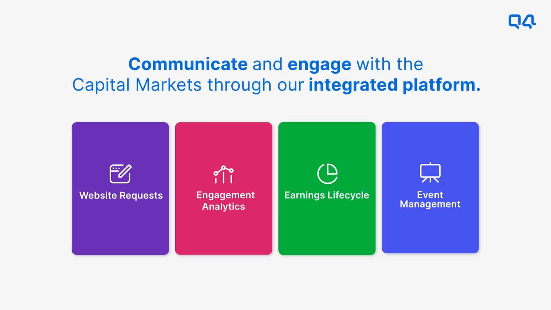 La plateforme Q4 facilite les interactions sur les marchés des capitaux grâce à des produits de sites Web de relations investisseurs, des solutions d’événements virtuels, des analyses du taux d’engagement, des relations investisseurs CRM, des analyses d’actionnaires et de marché, de la surveillance et des outils ESG. La plateforme Q4 est la seule plateforme globale d’accès aux marchés des capitaux qui stimule numériquement les connexions, analyse l’impact et cible le bon engagement pour permettre aux entreprises publiques de travailler plus rapidement et plus intelligemment.