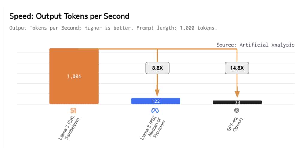 PALO ALTO, Californie–(BUSINESS WIRE)–SambaNova Systems, l’entreprise spécialisée dans les solutions d’IA générative qui propose les modèles les plus rapides et les puces les plus puissantes, est le grand vainqueur de la dernière étude comparative d’Artificial Analysis sur les grands modèles de langage (LLM). En tête de classement avec plus de 1000 jetons par seconde, Samba-1 Turbo établit un nouveau record de performance avec Llama 3 8B.