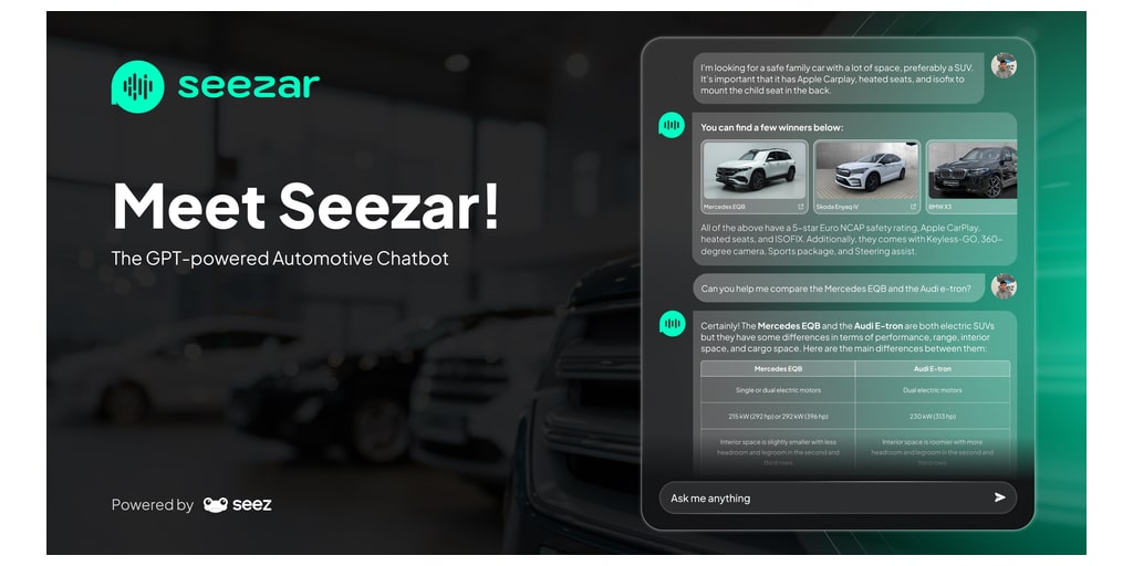 COPENHAGUE, Danemark–(BUSINESS WIRE)–Seez, la start-up de technologie automobile de pointe, fait des vagues avec « Seezar », un chatbot GPT innovant et conçu pour les concessionnaires d’Europe et du Moyen-Orient. Cette solution basée sur l’IA change la donne, révolutionnant les interactions et les opérations avec les clients dans le secteur automobile.