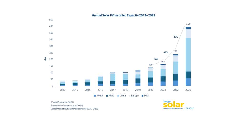 Les perspectives du marché mondial de l’énergie solaire 2024-2028 de SolarPower Europe font état d’une croissance mondiale du photovoltaïque de 87 % en 2023 par rapport à l’année précédente. Une capacité de 447 gigawatts (GW) a été installée, portant la capacité globale totale à 1,6 térawatt (TW). Pour mettre cela en perspective, seuls 239 GW ont été installés en 2022. Selon l’étude, nous devrions dépasser 2 TW de capacité totale dans le courant de l’année, le cap de 1 TW n’ayant été franchi qu’en 2022. Pour atteindre l’objectif mondial de tripler les énergies renouvelables d’ici 2030, il faudra financer, numériser et assouplir les systèmes énergétiques. Une capacité de 1 TW de capacité photovoltaïque pourrait être installé chaque année à partir de 2028.