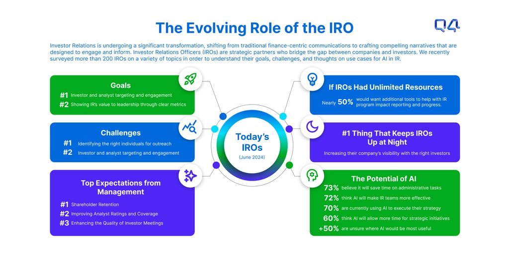 Darrell Heaps, fondateur et CEO de Q4, déclare : « Grâce à notre récent sondage et aux discussions avec nos clients existants, y compris les membres de notre conseil consultatif de clients, nous comprenons les défis auxquels les IRO sont confrontés et nous nous engageons à leur fournir les outils dont ils ont besoin pour réussir. Afin d’atténuer certains des problèmes auxquels les IRO sont confrontés, nos recherches ont révélé qu’il est nécessaire d’éduquer sur la manière dont la technologie, y compris l’IA, peut contribuer à accroître l’efficacité. »