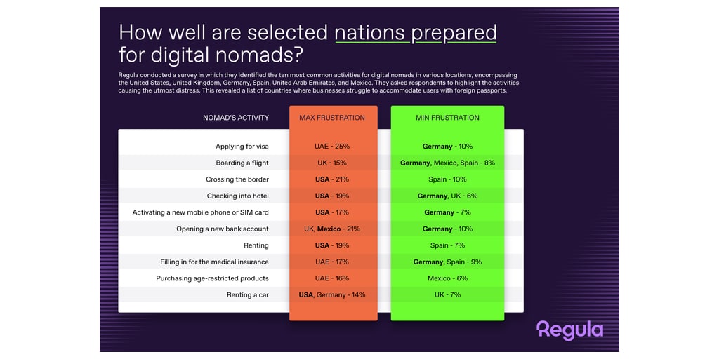 RESTON, Virginie–(BUSINESS WIRE)–Lors de son enquête sur le parcours des nomades numériques en tant que nouveaux clients, Regula a dressé une liste des dix activités les plus courantes dans différents pays, y compris les États-Unis, le Royaume-Uni, l’Allemagne, l’Espagne, les Émirats arabes unis et le Mexique. Les personnes interrogées ont ensuite été invitées à préciser les activités qui leur causaient le plus de difficultés. Grâce à cette approche, l’enquête a permis d’établir un classement comparatif des pays où les entreprises rencontrent des difficultés pour accueillir les utilisateurs possédant des documents d’identité étrangers.